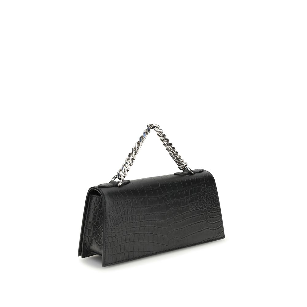 The Jeweled mini Shoulder Bag by Alexander McQueen is an elegant accessory featuring the iconic silver-tone Knuckle hardware and distinctive chain. It features a main compartment and an internal card slot, while the adjustable and removable leather shoulder strap and magnetic closure combine practicality and refined style in a compact and sophisticated design.